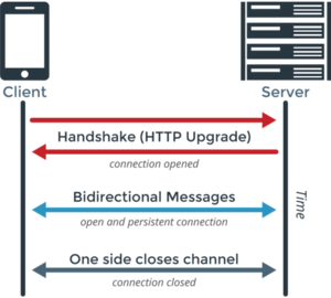 Websockets is a technology standard, implemented in most modern browsers, and in most languages and platforms (e.g. Android). After creating a websocket we will have a permanent bi-directional connection between a client and our server, this way, with little overhead, we can send data both ways without creating and destroying connections with each message.